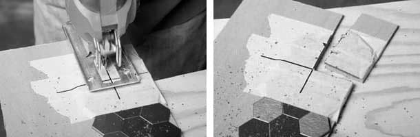 If cutting tiles is necessary, use one of our recommended tools listed above. A jig saw is the recommended cutting method. Alternative cutting methods are a miter box or hack saw for any necessary straight cuts. Use a hole saw or coping saw for circular cuts or electrical outlet cutouts. If a jigsaw is used, adhere the tiles to a solid substrate (E.g., plywood) with masking tape. Use a fine-tooth blade for cutting.
