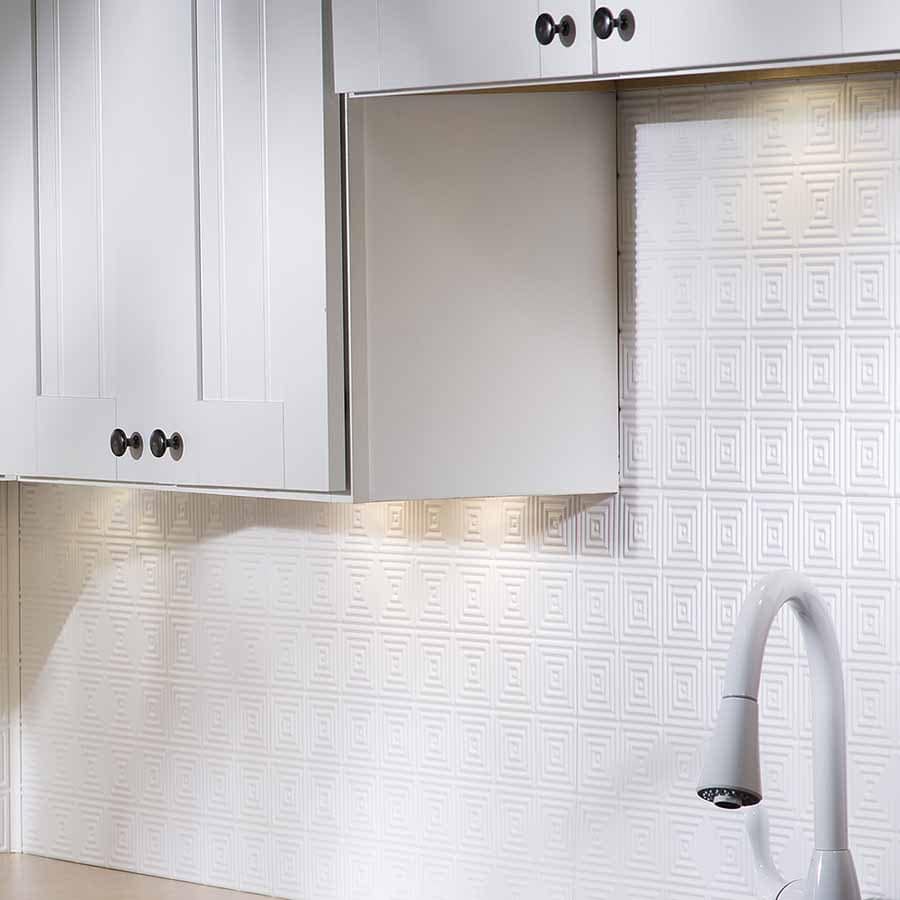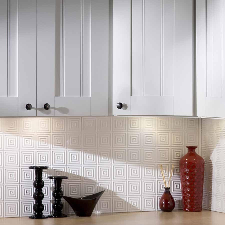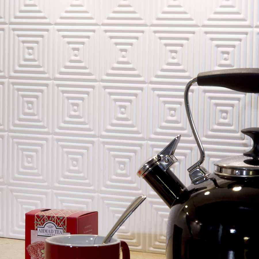 Fasade is an embossed vinyl panel that looks like tin and comes in various sizes and applications.
