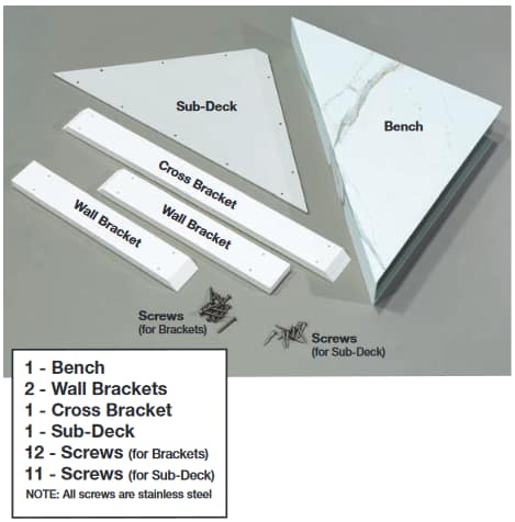 Note: If Palisade was installed over existing tile, you will need to use 1/4″ tapered anchors (examples below). Follow anchor install instructions to install anchors, but use the stainless steel screws provided with the bench.