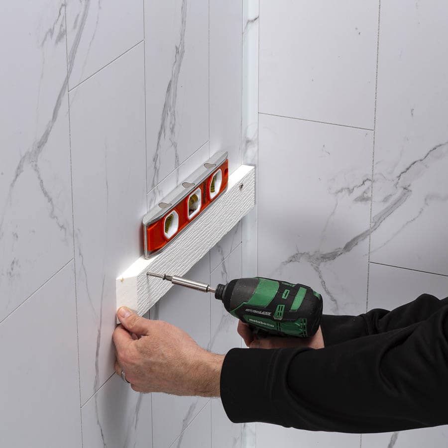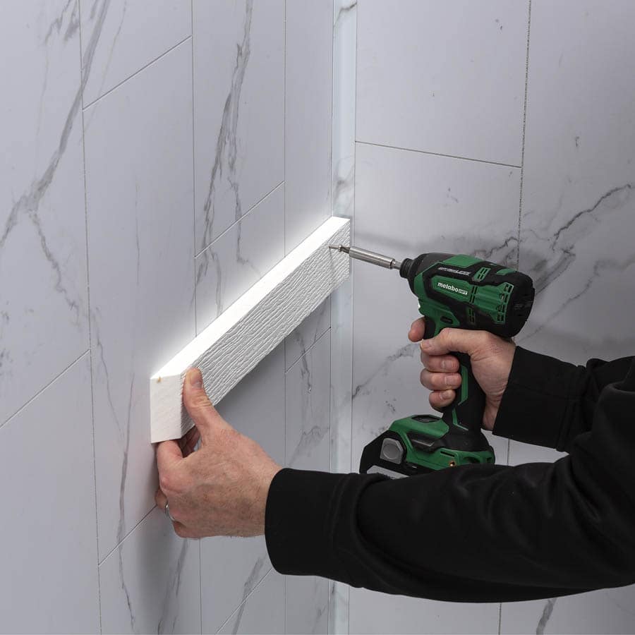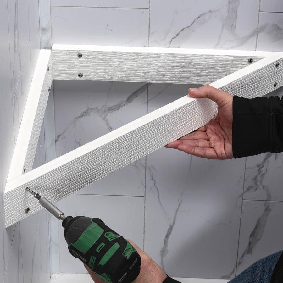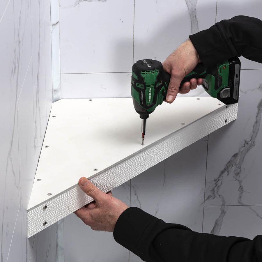 Install the first screw closest to the corner of the shower. Pre-drilled holes are provided for ease.