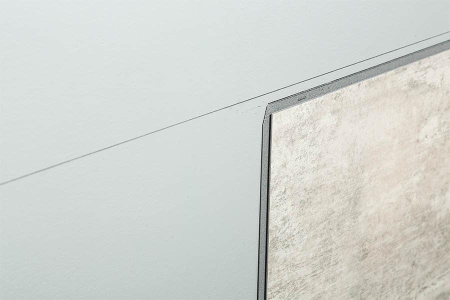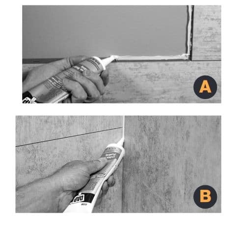 Installation in environments exposed to a direct flow of water (shower, mud room or garage) require a 1/8-inch bead of sealant to be used in all tongue and groove connections (image A). Add a bead of the sealant along recently cut edges to be placed into the corner. Repeat this process on perpendicular tile also facing corner (image B).