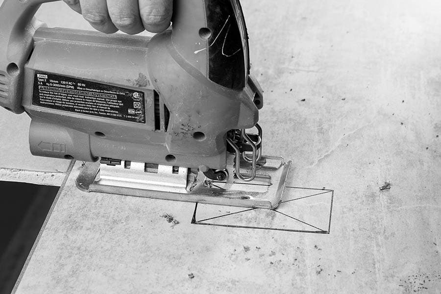 Cut panels for outlets and light switches. Measure and mark the borders where the opening will be with a marker. Drill a 1/2-inch hole using a drill in a corner of the cut-out section (image F). Use a jigsaw to cut the remaining opening, following your tracing (image G).