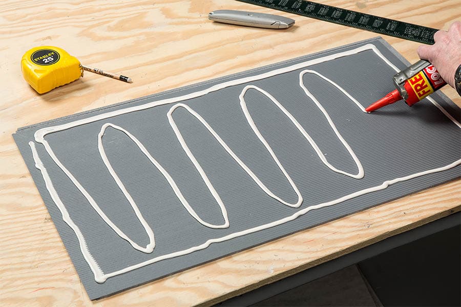 Apply adhesive to the back of the tile. Carefully read and follow adhesive manufacturer’s directions. Apply a 1/4-inch bead in a typical “M” or “W” pattern, and a bead around the tile perimeter about 1-inch in (image L).