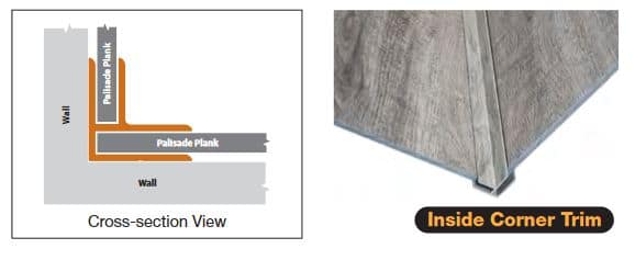 If you choose to finish the edges, we recommend our matching trim for both end pieces and inside corners. We recommend using baseboard or cove molding to finish the bottom row, regardless of flooring material. For both end trim pieces and corner trims, install trim in appropriate location prior to setting plank into trim (image H).