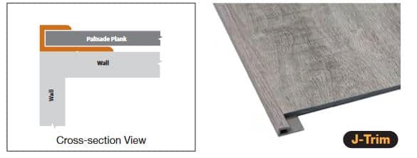 J-Trim are used to finish the terminal end of planks when not adjoined to anything. To install, don’t dispense adhesive a few inches from the plank’s edge where you intend to use the J-Trim. This will allow the trim to slide in place. Dispense a bead of sealant into the receiving channel of the trim and then press the trim into place.