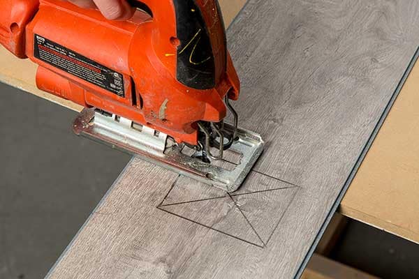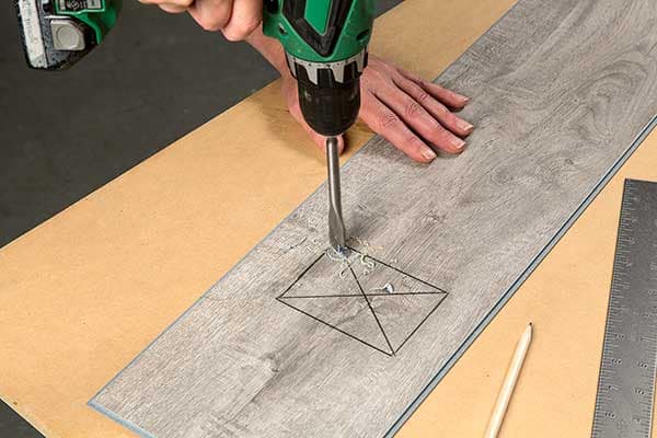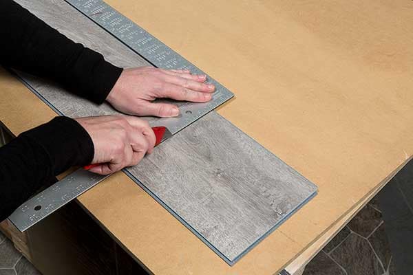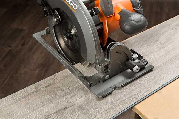 You can also use standard wood working tools like a table saw or circular saw with a fine-tooth blade to provide a clean, smooth cut (image E). Use a 60-tooth blade or higher. To ensure the base of the saw does not scratch the surface of the plank, we recommend protecting the surface with blue painter’s tape.