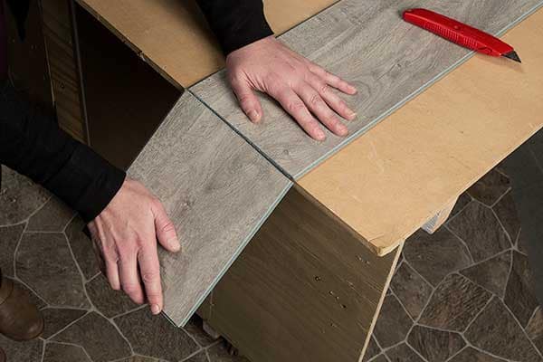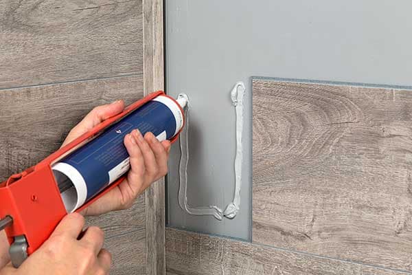 Add a bead of the sealant along recently cut edges to be placed into the corner. Repeat this process on perpendicular plank also facing corner (image B).
