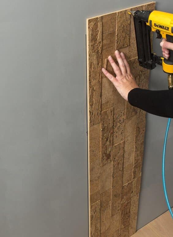 Starting on the floor, draw or snap a level line for reference at 13.5″ from the floor. Next, attach the first Cork Wall Panel in the left corner and add construction adhesive to the back of the panel and nail into place (see instructions to left). Repeat this process until you reach the right wall cutting the pieces as needed. Stagger the next row of panels over the joints and cut pieces to fit as needed until you reach the top termination point. Finally, add wood trim at the floor to finish your installations, if desired.